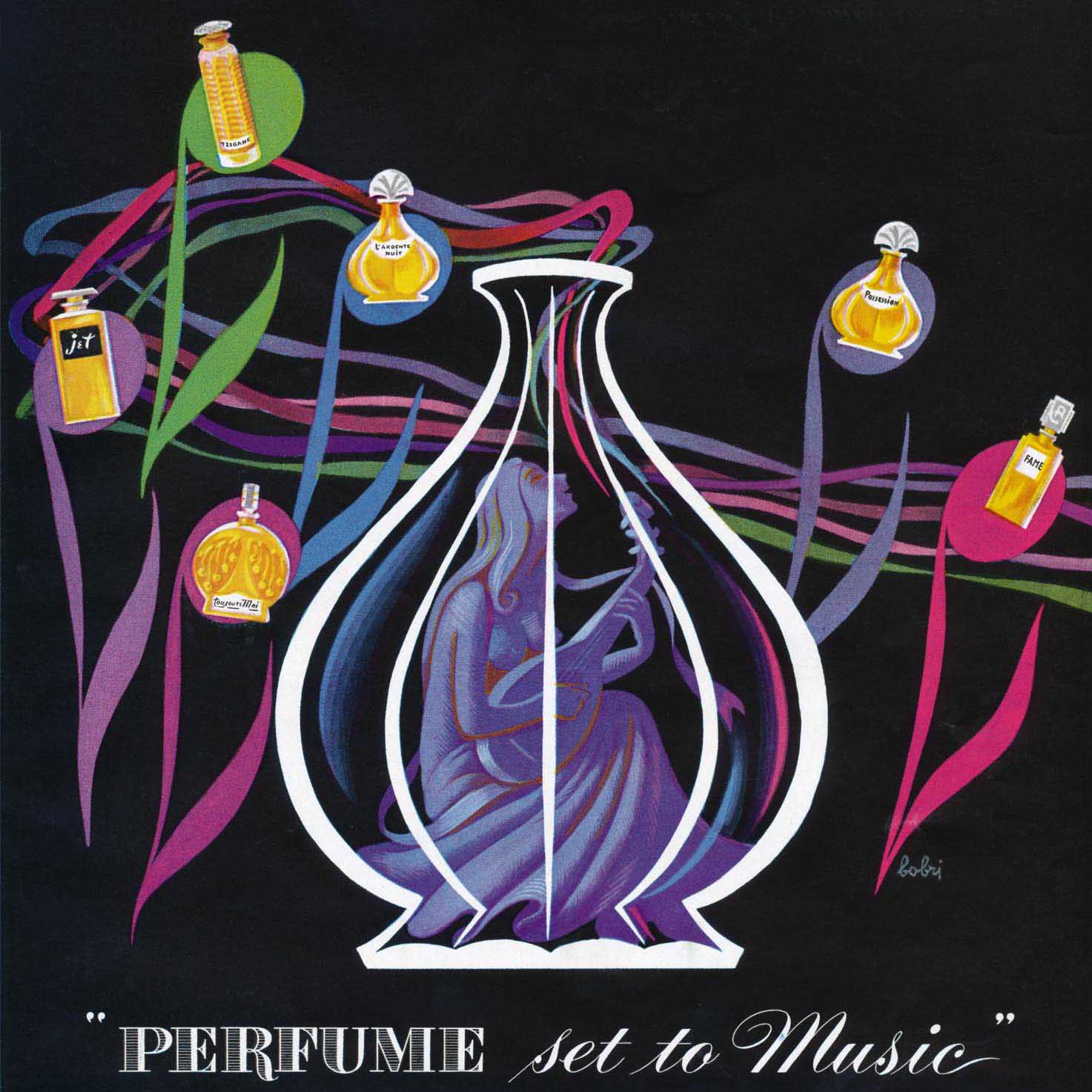 Passion can be inspired by both music and perfume. Many vanity items, perfume bottles, presentations, and advertisements play upon a musical theme. Instruments depicted include pianos, violins, cellos, harps, drums, cymbals, guitar, trumpet, accordion, mandolin, and more …