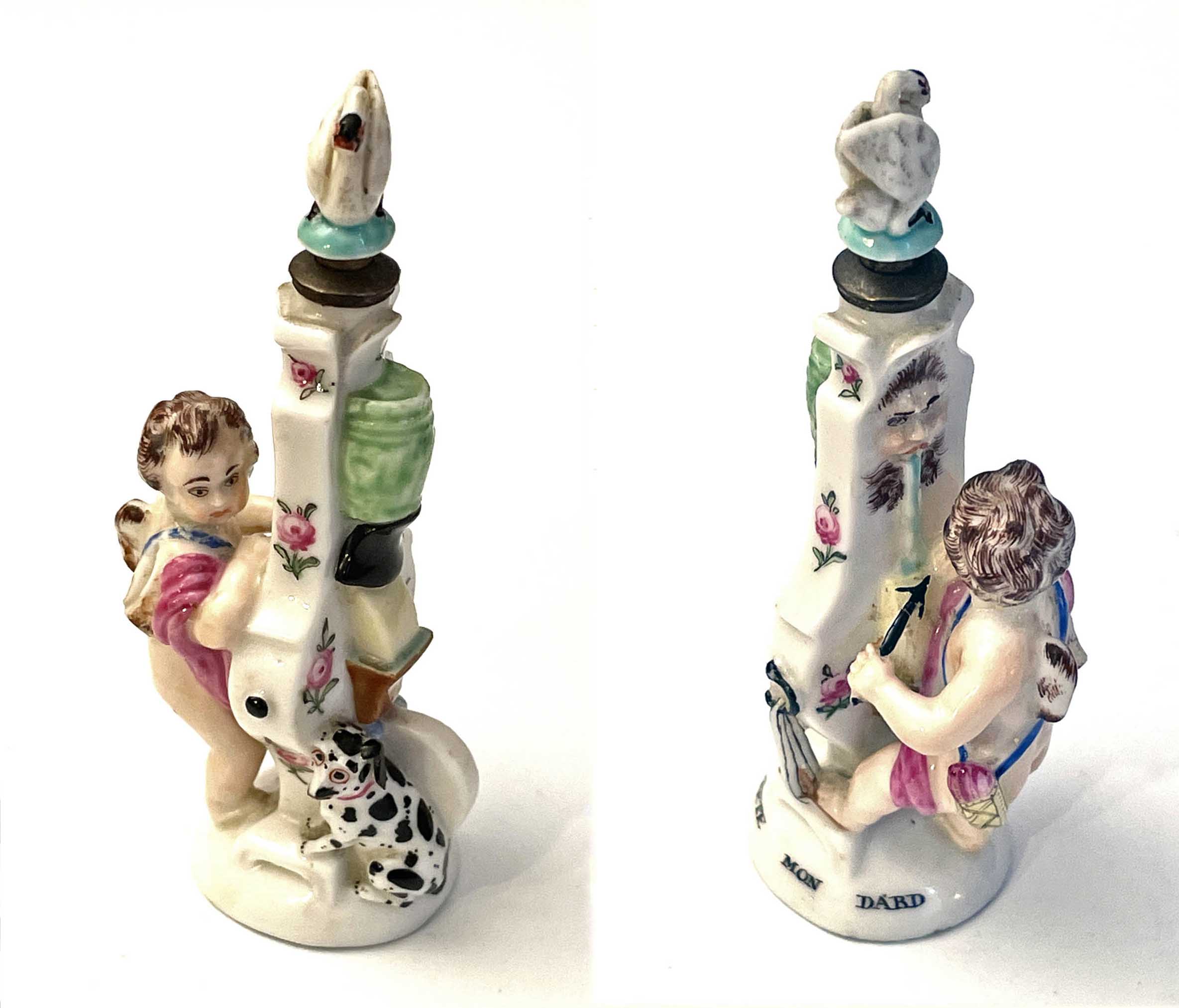 Porcelain bottle depicts Cupid at his grinder in front of a fountain with a mask face. At the bottom is a black spotted dog with his red collar. The porcelain bottle and stopper with brass fittings has a […]