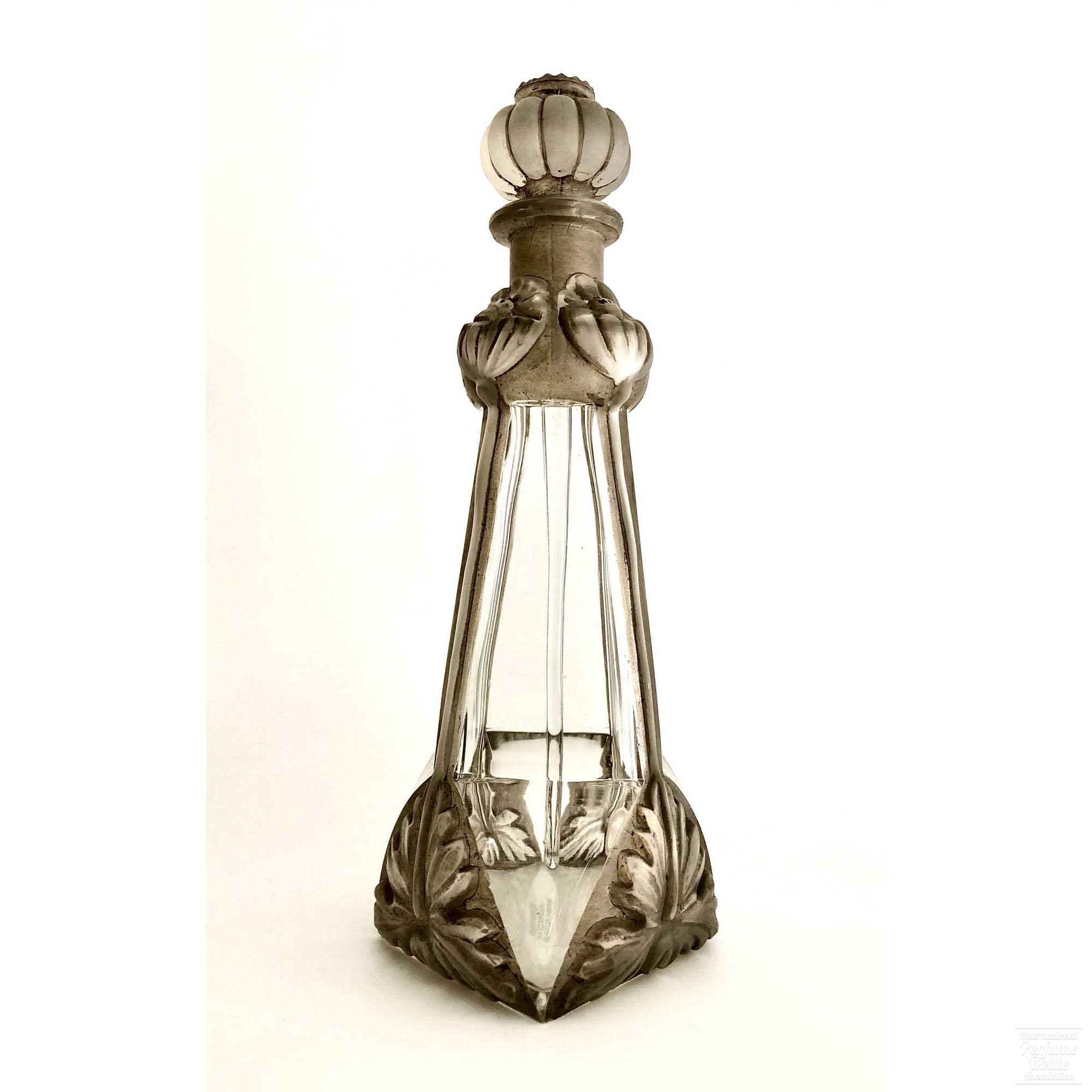 Tall, tapering bottle of clear crystal that features molded poppy blossoms at the top, with the stems running down the corners to leaves at the bottom. This decoration is frosted with warm grey staining. The stopper is molded […]