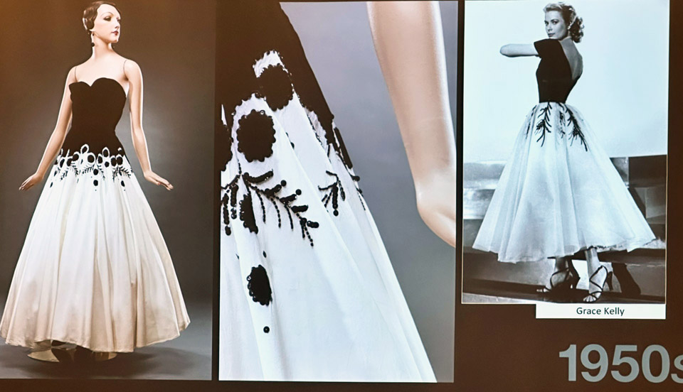 Don Orban’s Keynote presentation, “Star Struck! Hollywood’s Golden Age of Glitter, Glamour, Gowns and the Desire to Make it all Yours”, revealed fashions from the 1920’s through the 1960’s. Hollywood’s glamourous stars were impeccably dressed, and these fashions were copied by designers offering a more affordable price tag. Using gowns and dresses from his personal collection, Don showed the glamourous gowns next to the affordable gowns. In many cases, he had photos of the stars wearing similar items. Don enhanced the presentation with details on the beading, and the difficult construction of a gown which led to an intricate ballet of steps needed to actually wear the gown.